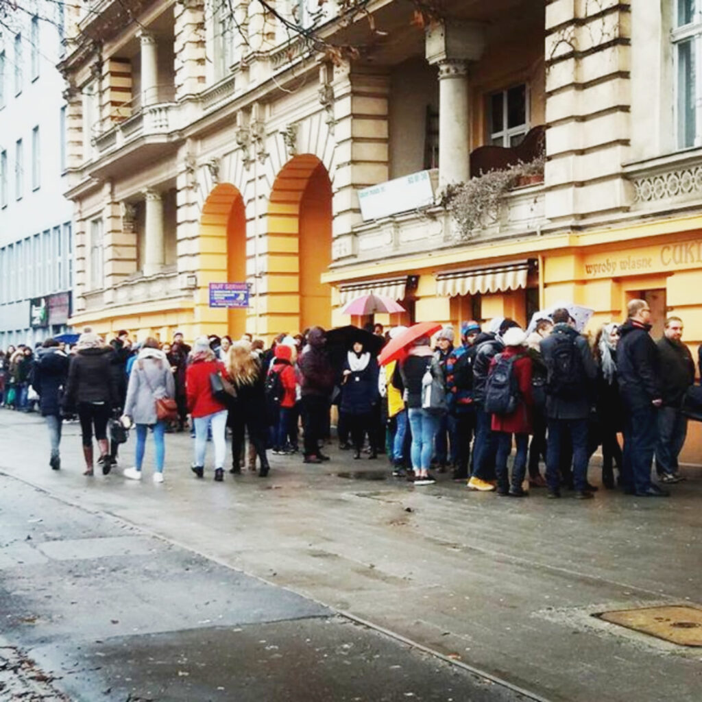 Kolejki do cukierni stoją na dworze praktycznie codziennie, ale w Tłusty Czwartek są zdecydowanie najdłuższe we Wrocławiu. W ogonku czeka nawet kilkaset osób. Pączki w tym miejscu można kupić od 1961 roku. Klienci najbardziej chwalą sobie te z różaną konfiturą.