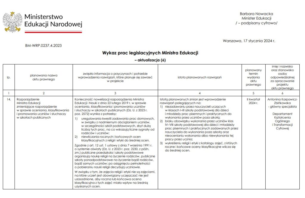 Oceny z religii nie będą wliczane do średniej ocen – zdecydowało Ministerstwo Edukacji Narodowej. Nowe przepisy mają się pojawić w tym samym rozporządzeniu, które zniesie zadania domowe w szkołach podstawowych. Ministerstwo już nad nim pracuje – ma obowiązywać od kwietnia.