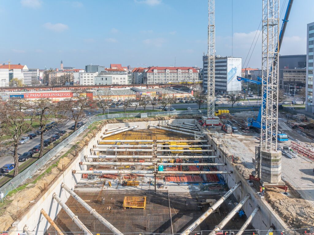 11-piętrowy biurowiec, który powstaje w miejscu stacji benzynowej BP przy dawnym Hotelu Wrocław (vis a vis Pasażu Zielińskiego), właśnie wyszedł spod ziemi. Budynek ma być gotowy w połowie 2025 roku.