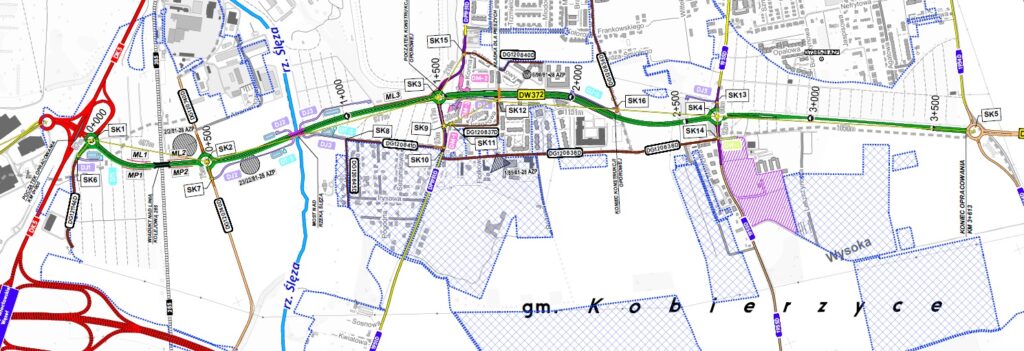Jest już znana dokładna mapa pokazująca przebieg nowej trasy. Poprowadzi ona m.in. w sąsiedztwie toru wyścigów konnych na Partynicach oraz szkoły w Wysokiej oraz między osiedlami przy ul. Konnej i Wysokiej na Ołtaszynie. Początek drogi wyznaczono na skrzyżowaniu z al. Karkonoską – pod estakadą między ogródkami działkowymi a rondem Wielkiej Orkiestry Świątecznej Pomocy (koło salonu Agata Meble).