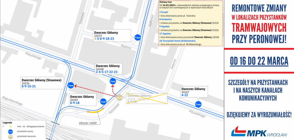 Dla wzmocnienia połączenia Dworca Głównego z placem Dominikańskim przez ulicę Kołłątaja, tramwaje linii 17 jadące w kierunku pętli “Sępolno” zostaną skierowane objazdem od ulicy Świdnickiej przez ulicę Piłsudskiego i Kołłątaja do ulicy Piotra Skargi z pominięciem przystanków: “Renoma”, “Opera” i “Park Staromiejski” – w kierunku przeciwnym trasa pozostanie bez zmian, czyli przez ulicę Teatralną i Świdnicką.