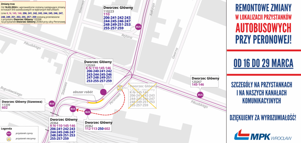 Dodatkowo, przystanek autobusowy dla linii K, N, 145, 146 oraz kursów nocnych linii 206, 241, 242, 243, 244, 245, 246, 247, 248, 249, 251, 253, 255, 257 i 259 jadących w kierunku centrum miasta zlokalizowany przy ulicy Peronowej przed skrzyżowaniem z ulicą Piłsudskiego (przystanek tramwajowy przy torowisku), zostanie przeniesiony do zatoki autobusowej przy ulicy Peronowej z boku Dworca PKP (przystanek dla autobusów linii 112 i 113)