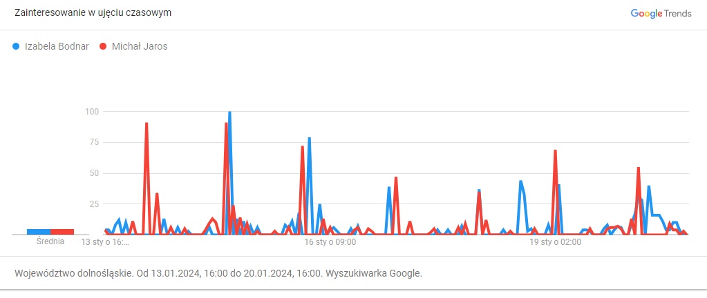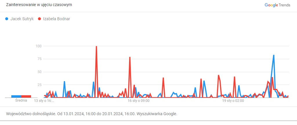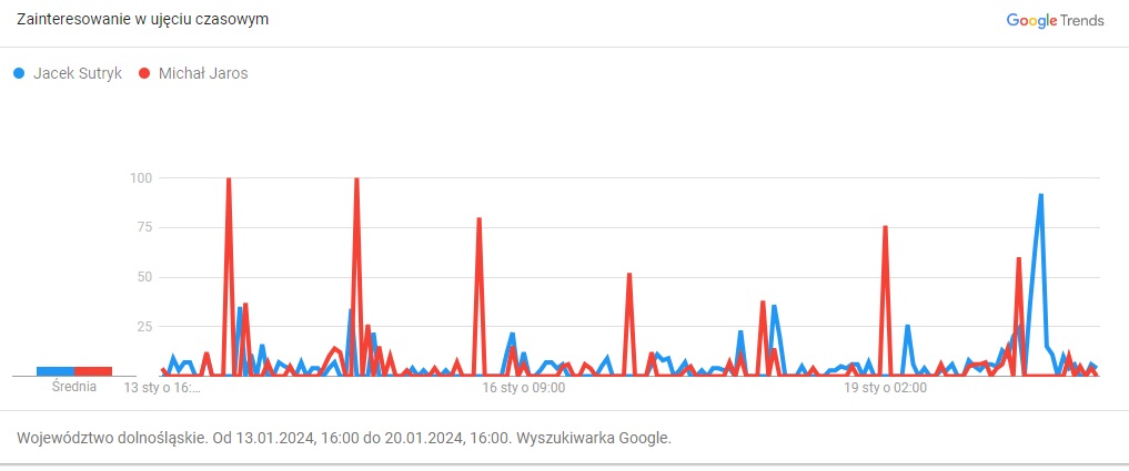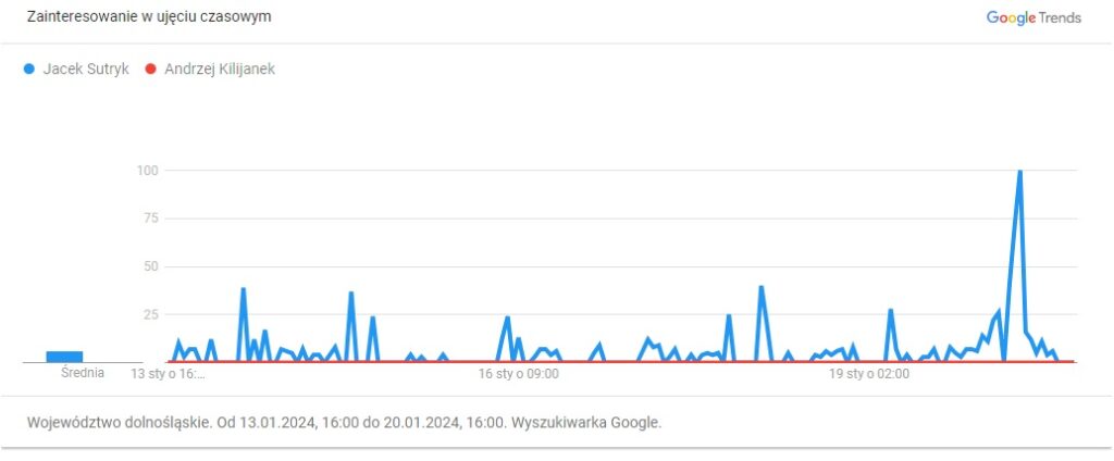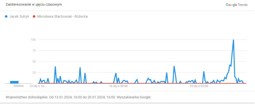 Co się okazało? Izabela Bodnar i Michał Jaros wzbudzają większa zainteresowanie osób korzystających z wyszukiwarki niż Jacek Sutryk. Obecny prezydent Wrocławia pokonuje tu tylko prawdopodobnego kandydata PiS (Andrzej Kilianek lub Mirosława Stachowiak – Różecka) oraz kandydata Zielonych (Robert Suligowski).