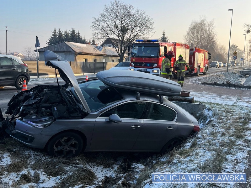 Tylko cudem nikt nie ucierpiał w wypadku, do jakiego doszło w środę rano w Dobrzykowicach pod Wrocławiem. Na ulicy Wrocławskiej (to droga z Wrocławia do Jelcza – Laskowic) kierowca peugeota wyprzedzający śmieciarkę i auto osobowe stracił panowanie nad autem, wpadł do rowu i uderzył w słup latarni.