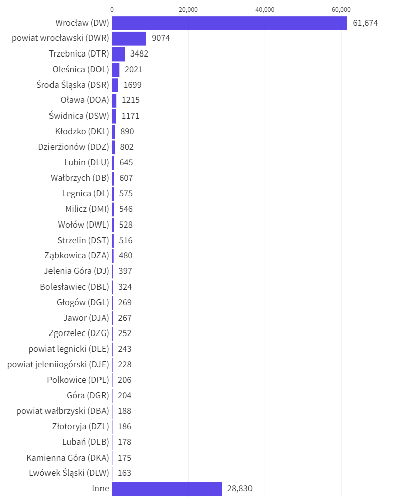Ponad 9 tysięcy samochodów tylko jednego dnia przyjechało do Wrocławia z powiatu wrocławskiego, prawie 3,5 tysiąca – z Trzebnicy, a nieco ponad 2 tysiące – z Oleśnicy. Znacznie rzadziej w stolicy Dolnego Śląska pojawiają się auta z Legnicy, Wałbrzycha czy Jeleniej Góry. Najmniej jest zaś tych z Lwówka Śląskiego i Kamiennej Góry.
